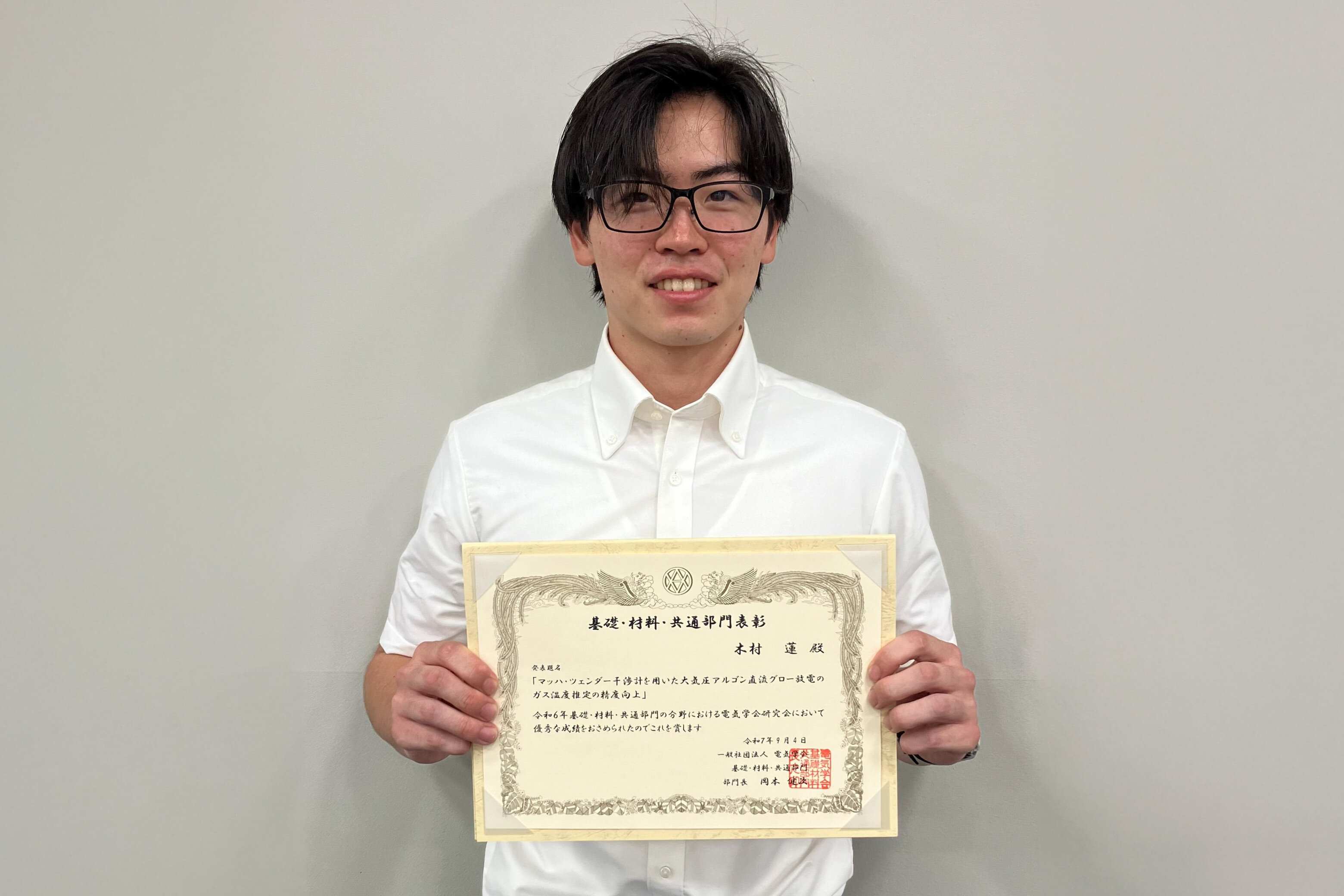 修士2年の木村さんが、「マッハ・ツェンダー干渉計を用いた大気圧アルゴン直流グロー放電のガス温度推定の精度向上」の研究について電気学会優秀論文発表賞を受賞しました。