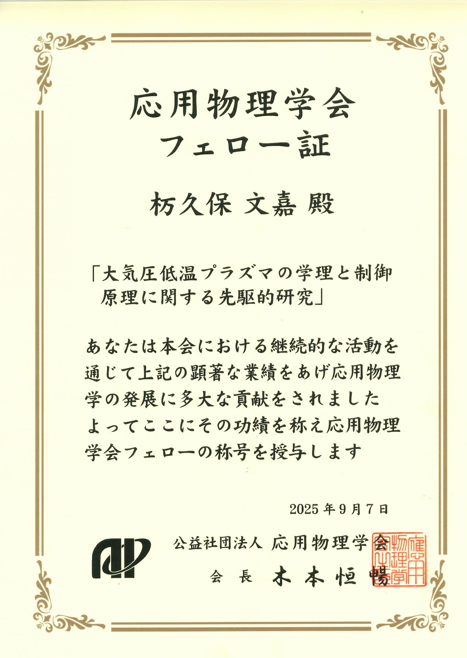 杤久保文嘉教授が応用物理学会より「大気圧低温プラズマの学理と制御原理に関する先駆的研究」 の業績に対してフェローを授与されました。